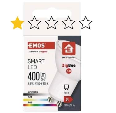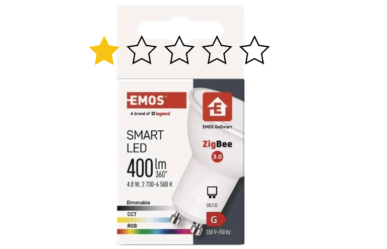 - Can be connected to ZigBee network only once. If you decide to move lamp to another place it may not work. “Emos” does not have instructions or manual how to reconnect lamp – disposable lamp, no further testing was made.